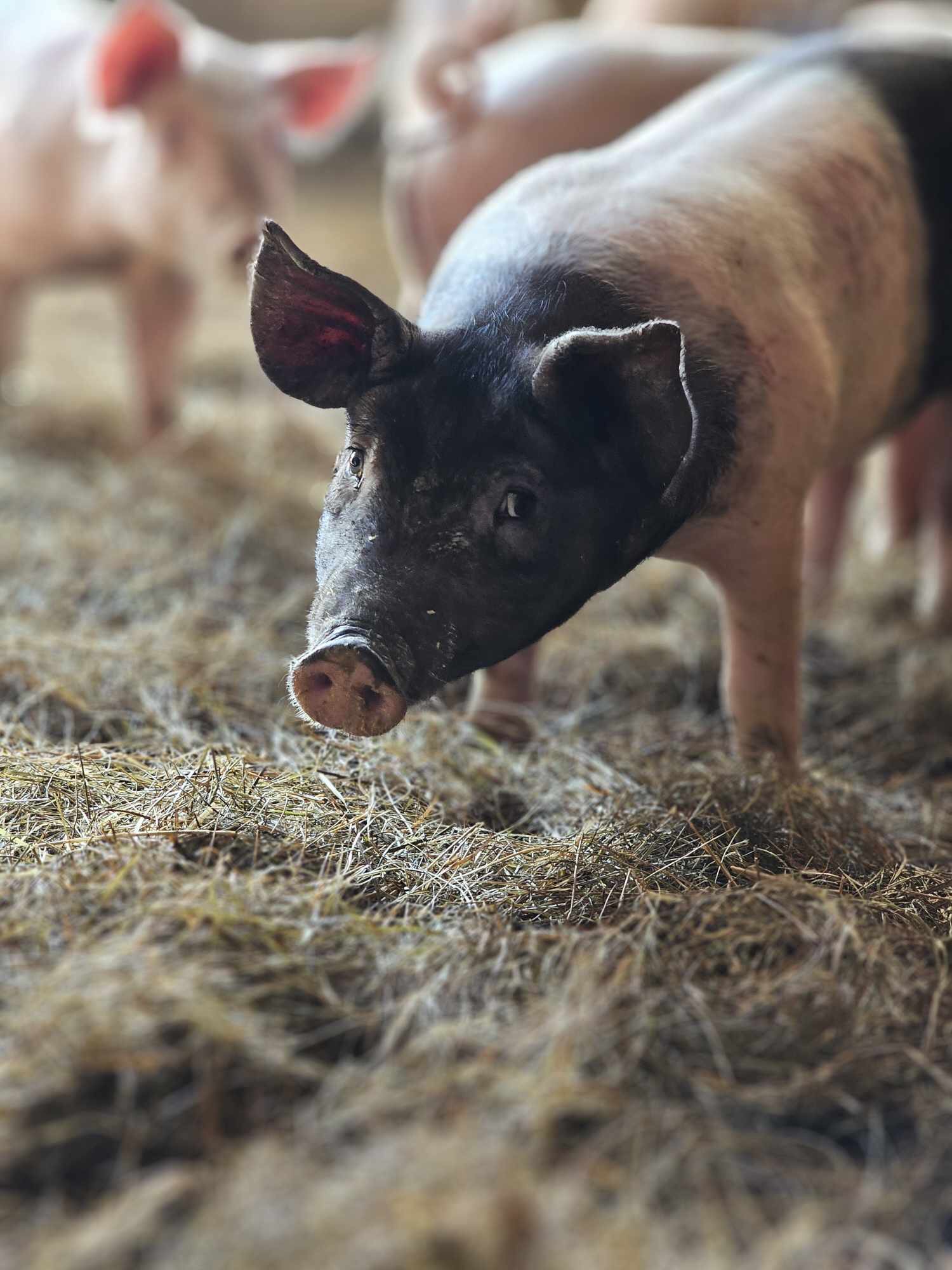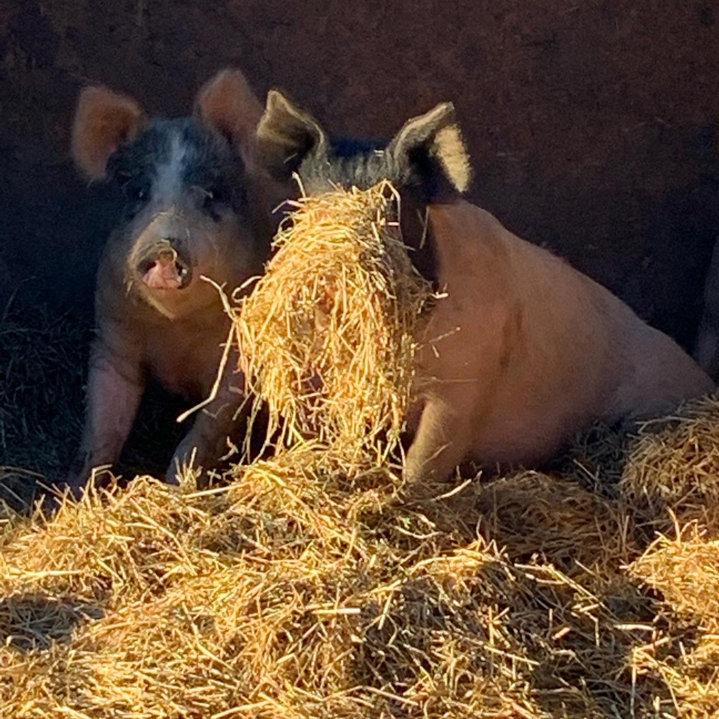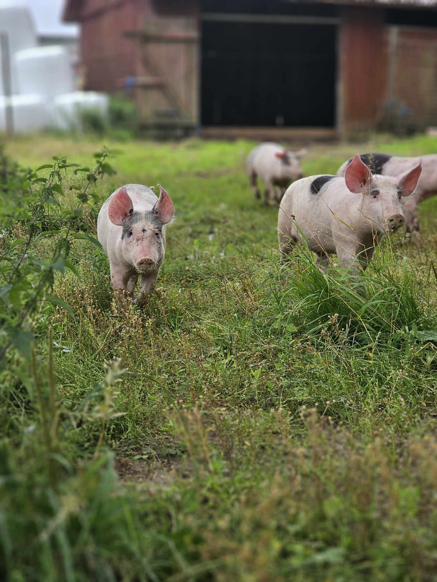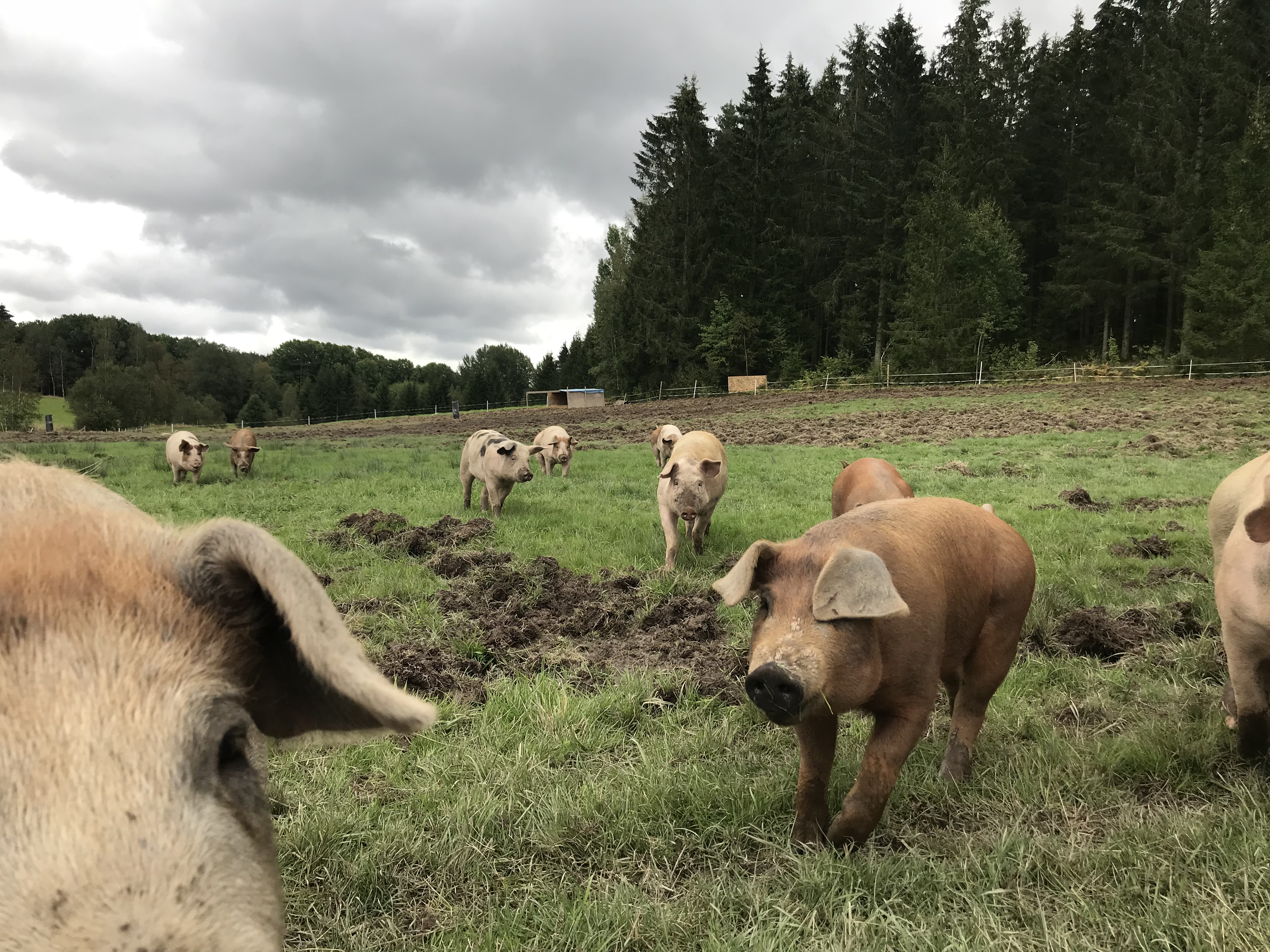 Grislivet på vår gård är en konstrast till grisarna i en storskalig produktion. De går ute o bökar hela sommaren/ o har ett fint fritt grisliv. Naturligt i flock o stora fria ytor. En hus att sova i/ gömma sig för solen. Jord/lera att bada i. En flock med grisar att leva med så de får använda sina sociala instinkter. Lugn och stilla utfodring utan nämnbar stress. Eftersom de är en liten flock på under 20 individer har vi personlig kontakt med dem dagligen.