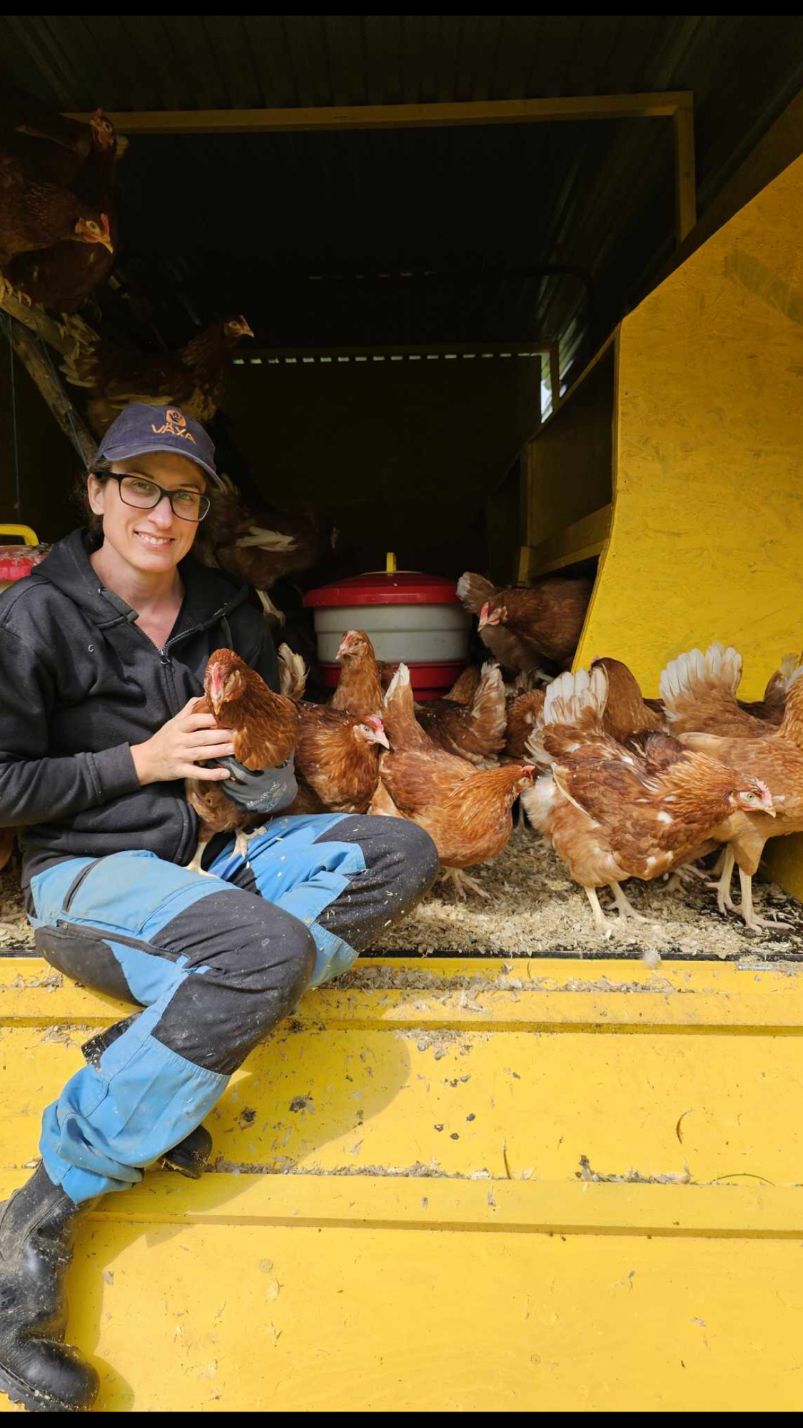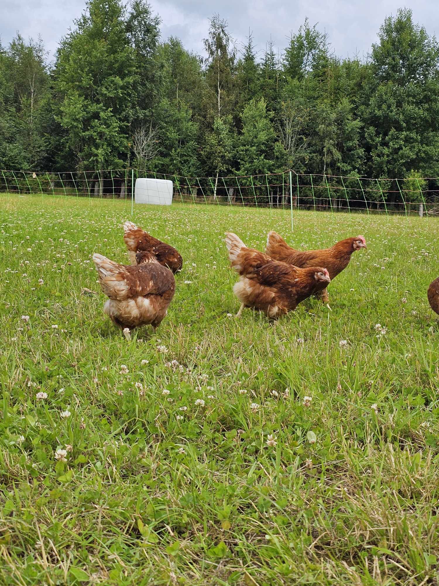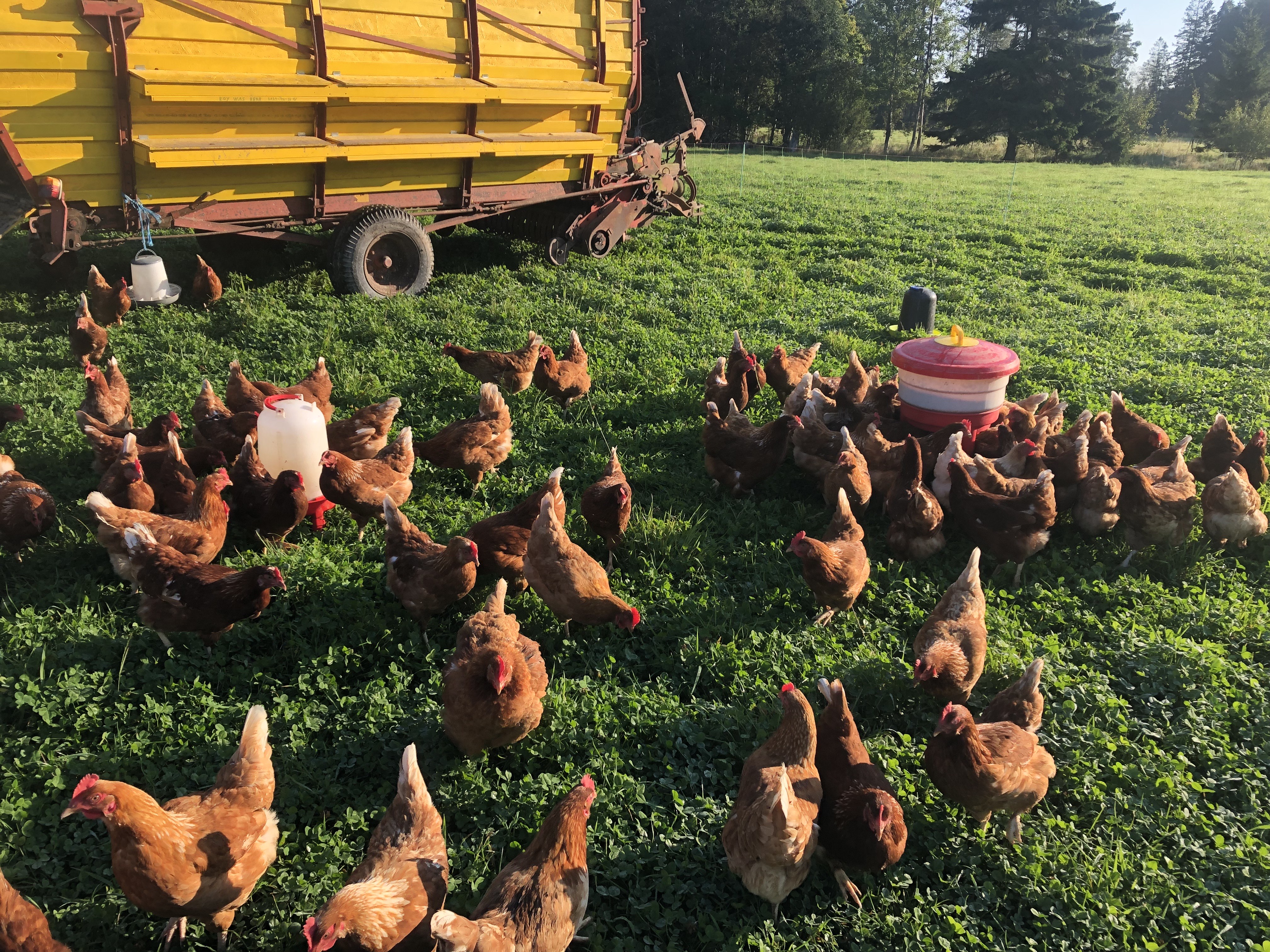 Våra frigående höns går ute som grönbeteshöns under varmare delen av året. (April-nov) De har en hönsvagn de går in i under natten, där de sitter på pinnar och har reden att lägga äggen i. Under dagen är de ute och lever ett härligt hönsliv i sin stora gräshage. När det behövs flyttar vi vagnen och hagen för att de ska få nytt bete. Vi har ca 150 st höns nu i två grupper. De äter svenskt värpfoder från Lantmännen och en massa grönt gräs. Vilket syns för ägg-gulorna blir härligt gyllengula! (Ej fiskmjöl i vårt foder) Under vintern går de inomhus med väl tilltagna ytor, daglig stimuli och lugnt och skönt. Våra höns har ett fritt och härligt liv på vår gård. Ett alternativ om du vill äta schysst producerade ägg istället för storskaligt producerade hönsägg.