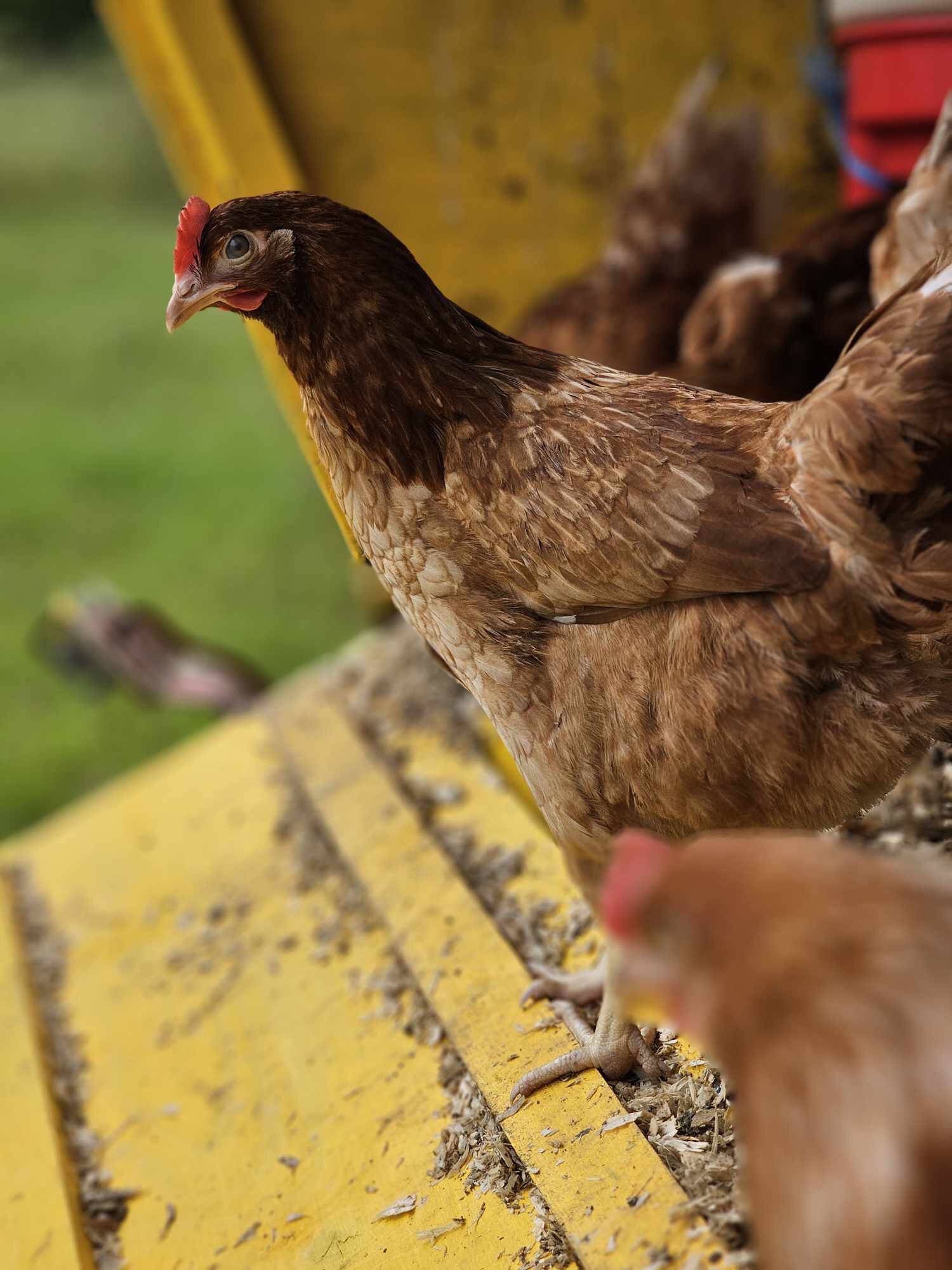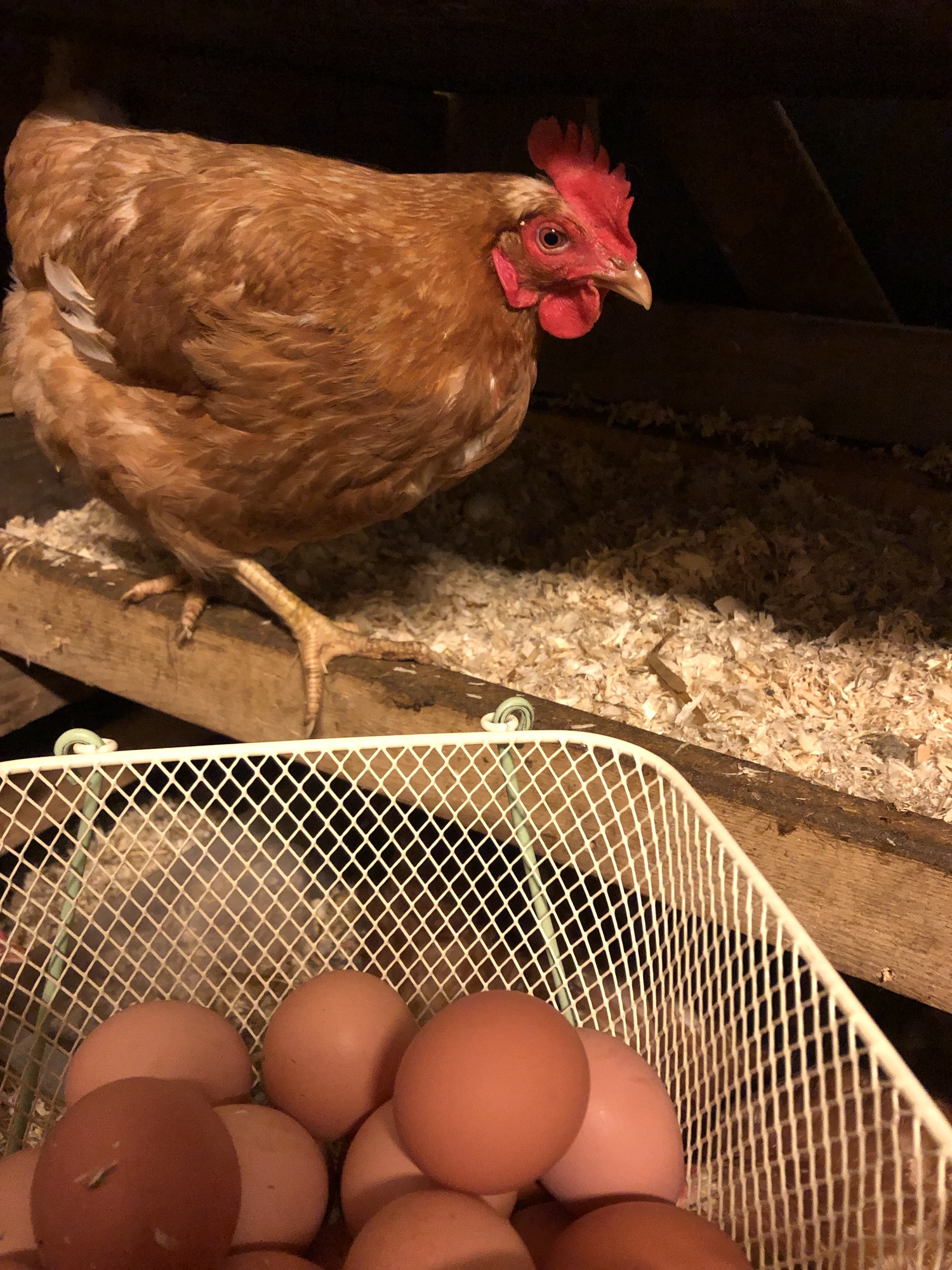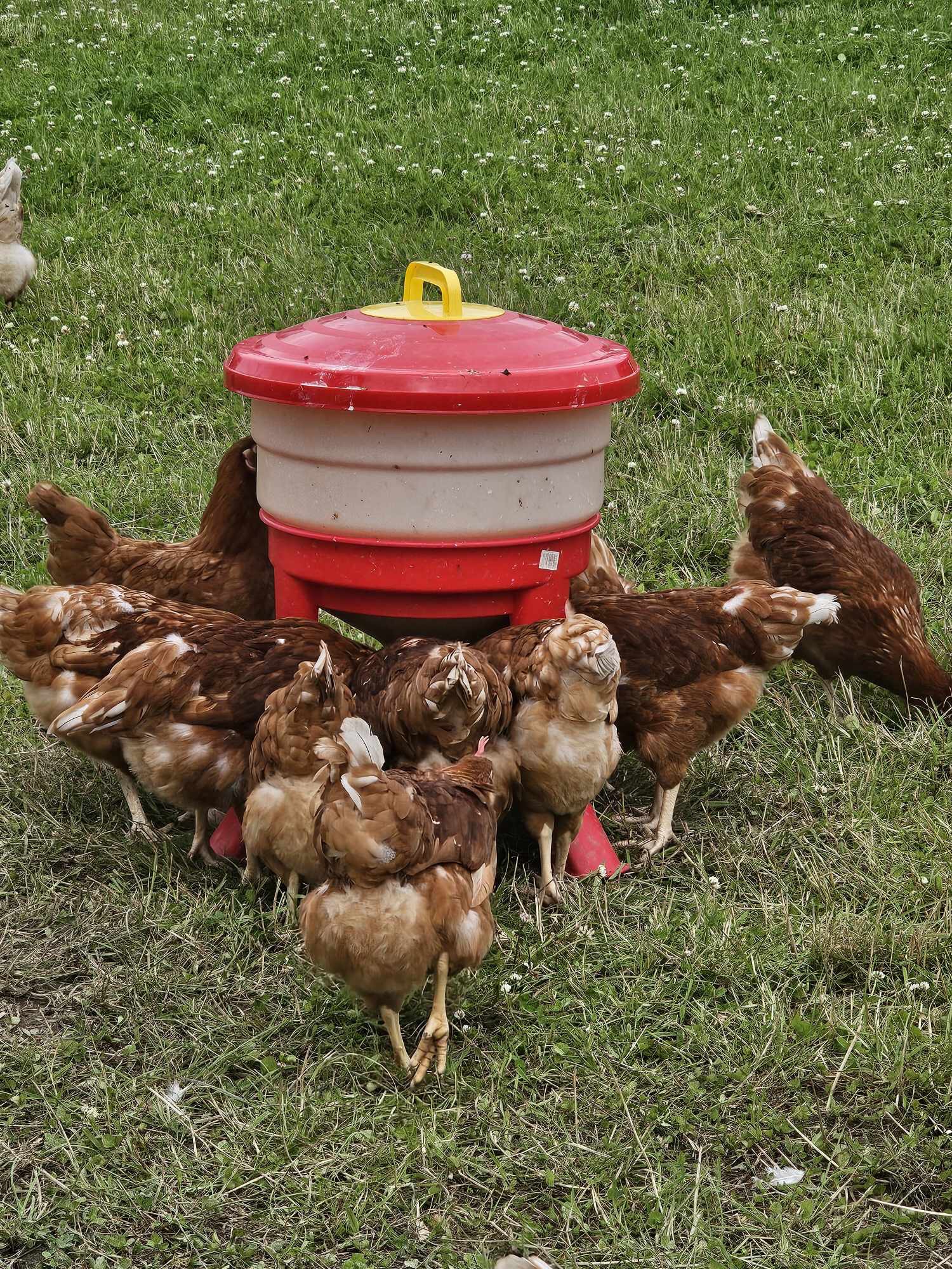Våra frigående höns går ute som grönbeteshöns under varmare delen av året. (April-nov) De har en hönsvagn de går in i under natten, där de sitter på pinnar och har reden att lägga äggen i. Under dagen är de ute och lever ett härligt hönsliv i sin stora gräshage. När det behövs flyttar vi vagnen och hagen för att de ska få nytt bete. Vi har ca 150 st höns nu i två grupper. De äter svenskt värpfoder från Lantmännen och en massa grönt gräs. Vilket syns för ägg-gulorna blir härligt gyllengula! (Ej fiskmjöl i vårt foder) Under vintern går de inomhus med väl tilltagna ytor, daglig stimuli och lugnt och skönt. Våra höns har ett fritt och härligt liv på vår gård. Ett alternativ om du vill äta schysst producerade ägg istället för storskaligt producerade hönsägg.