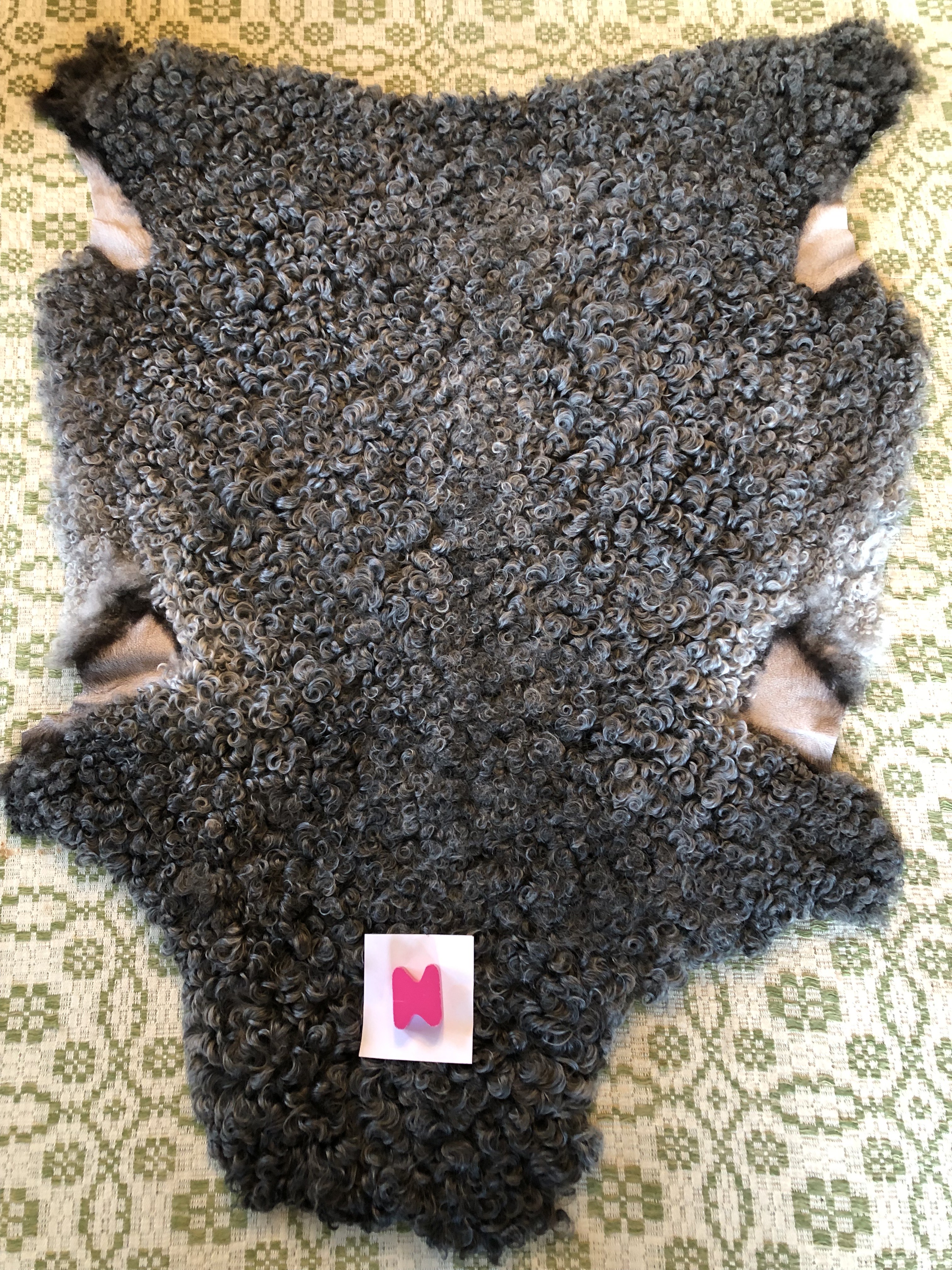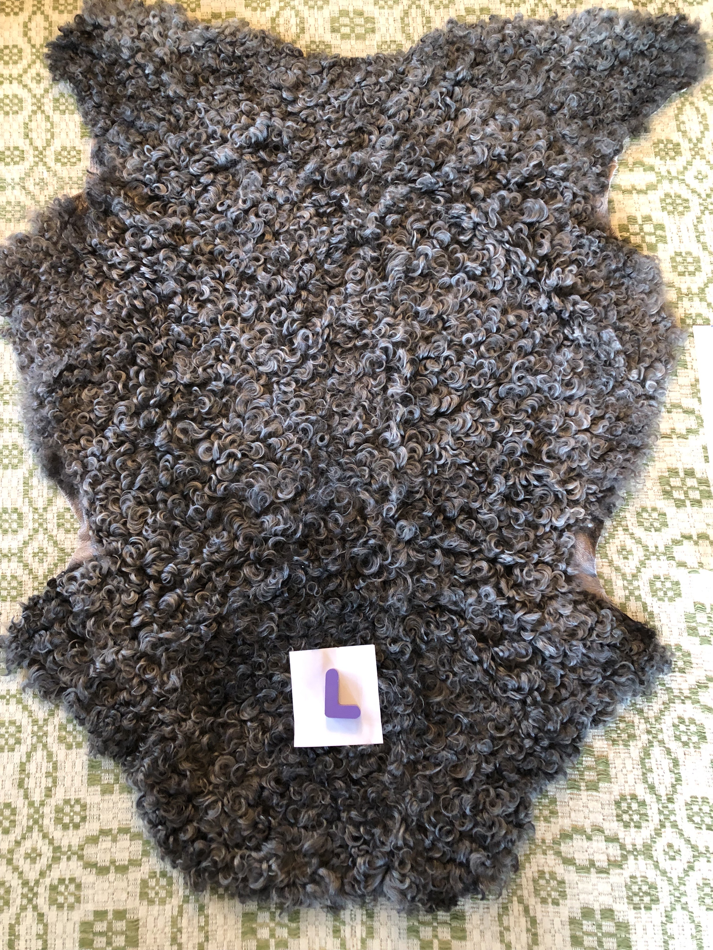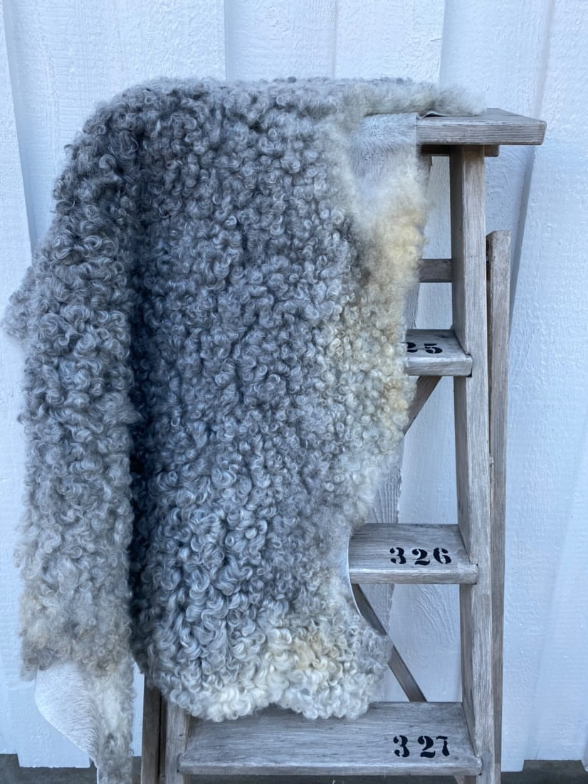 N. Mörkt grått skinn med lite ljusare sidor, glansigt, mjukt, täta lockar, 100 cm x 78 cm, 2600 kr ❌SÅLD ❌