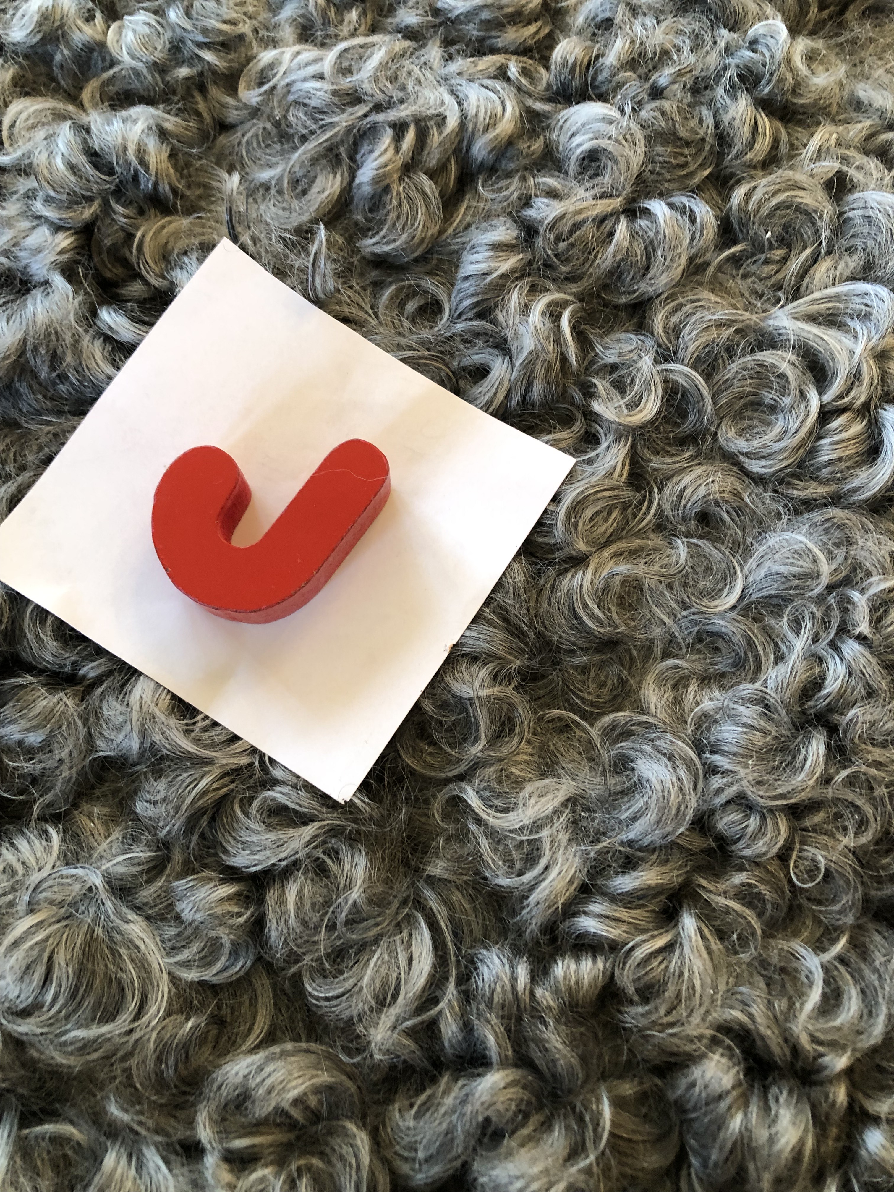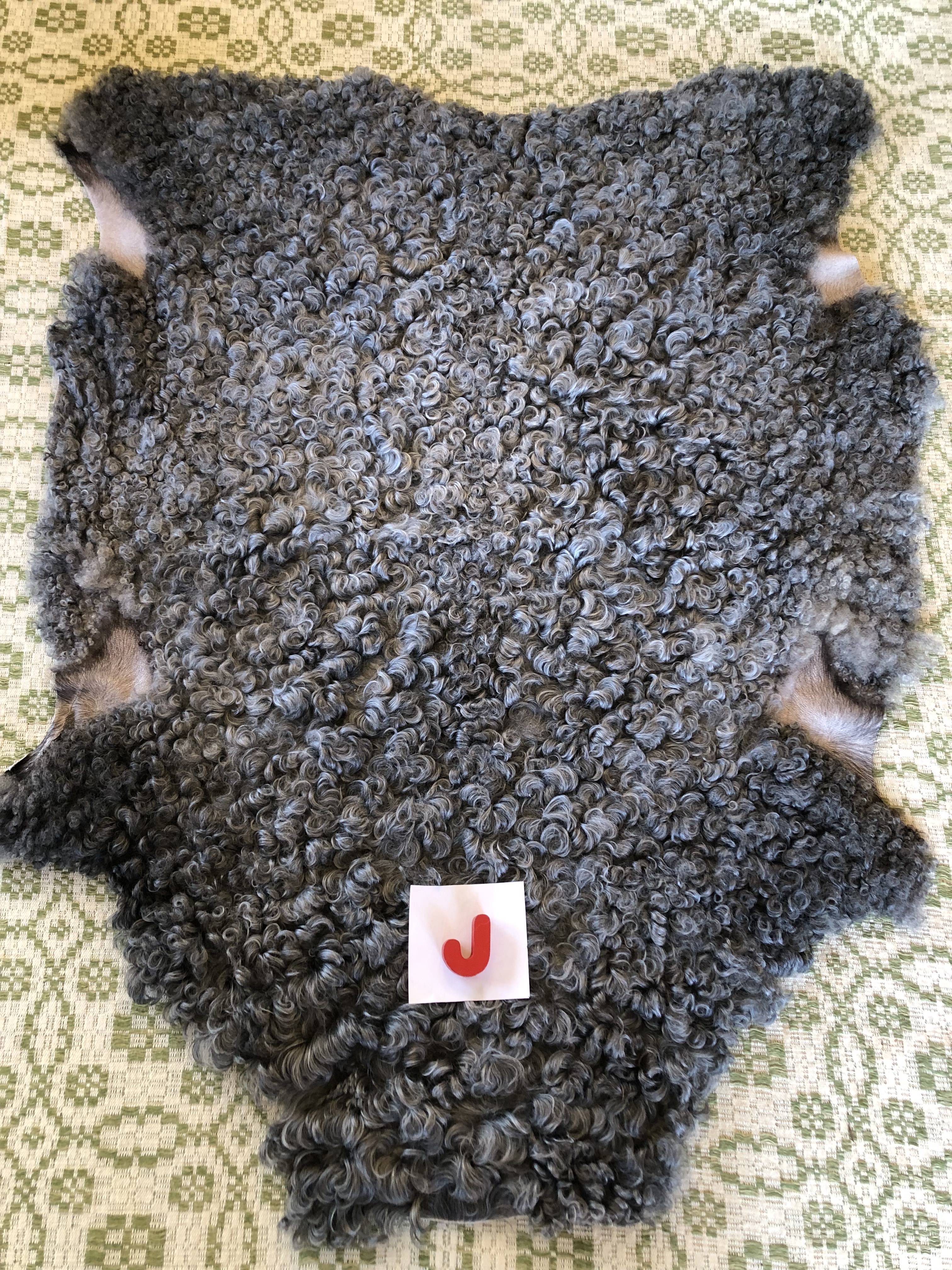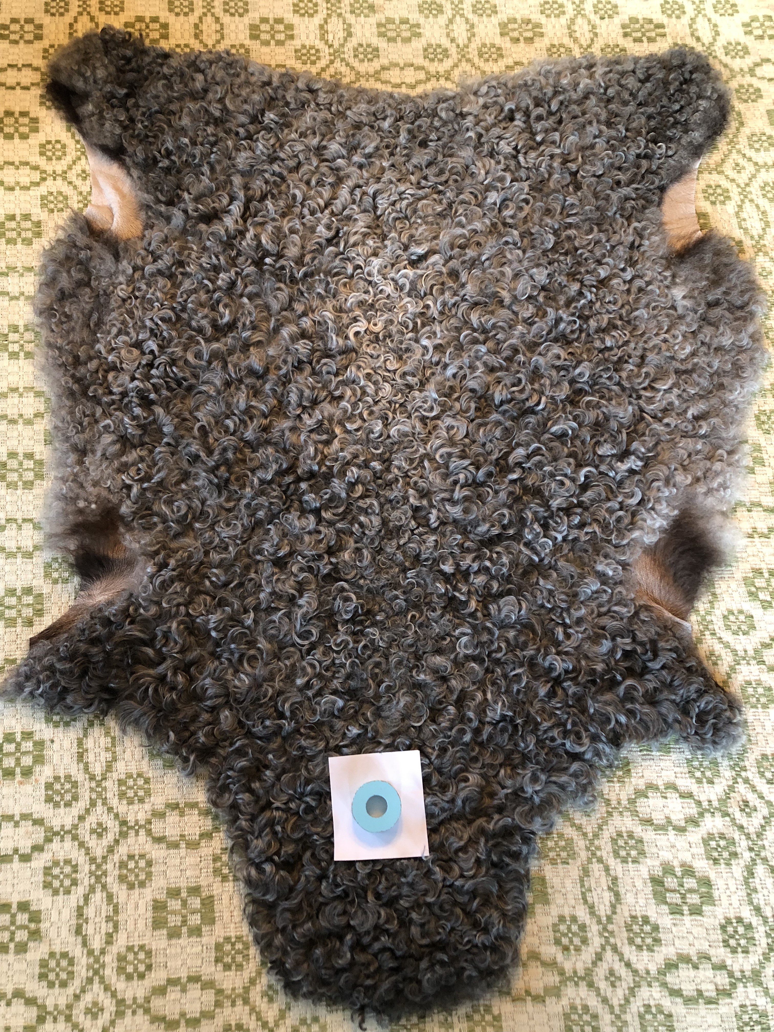 N. Mörkt grått skinn med lite ljusare sidor, glansigt, mjukt, täta lockar, 100 cm x 78 cm, 2600 kr ❌SÅLD ❌