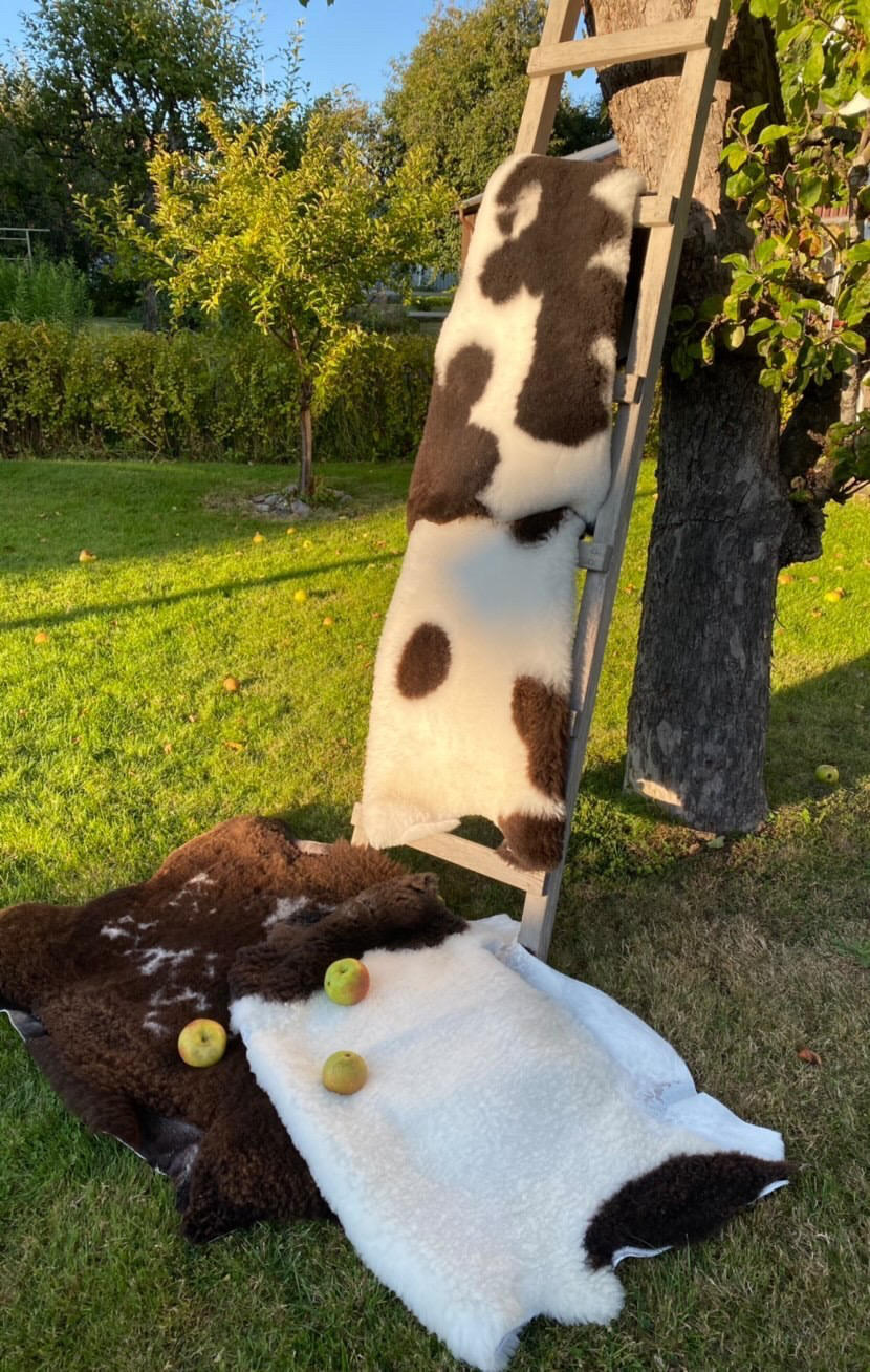 Våra lammskinn kommer från lamm/får på vår gård eller andra lokala samarbetspartners. Endast svenskt uppfödda lamm. Skinnen är tvättbara, men vi brukar råda att använda husmorstips först o främst, om olyckan är framme. Ett bra tvättråd är att lägga ut dem i kall snö med ullsidan mot snön.