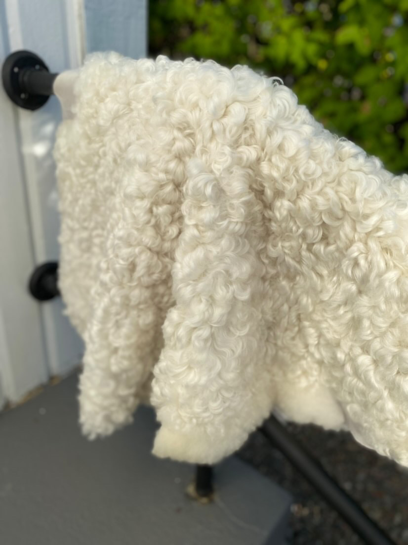 H. Vitt, Lyxigt lockigt, glansigt skinn, underbara lockar, stort, 117 cm x 80 cm, 2800 kr ❌SÅLD❌