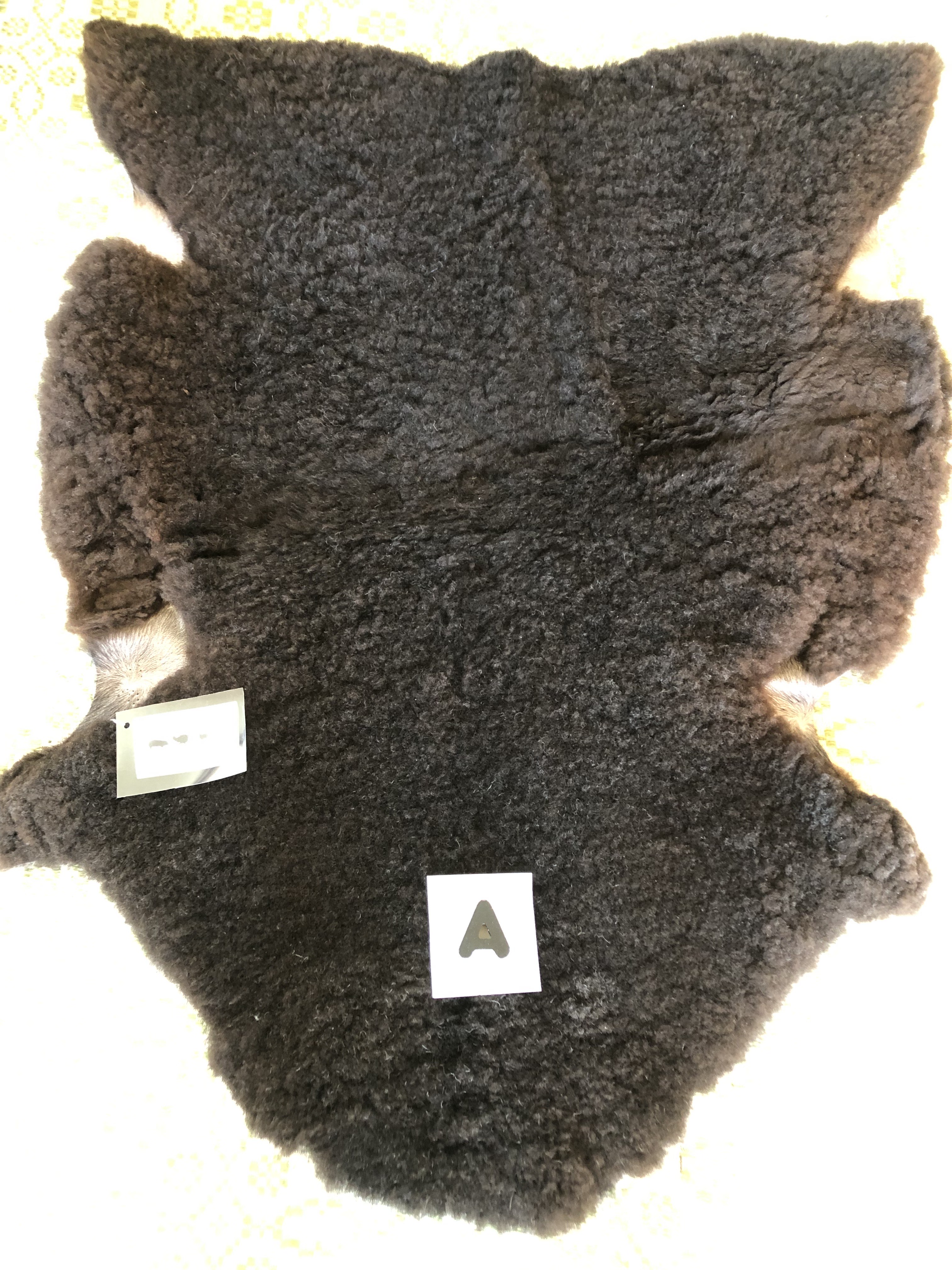 F. Mörkt brunt skinn, medel ull, mjukt, fluffigt, mysigt, jämnt, 108 cm x 82 cm, 1400 kr ❌såld ❌