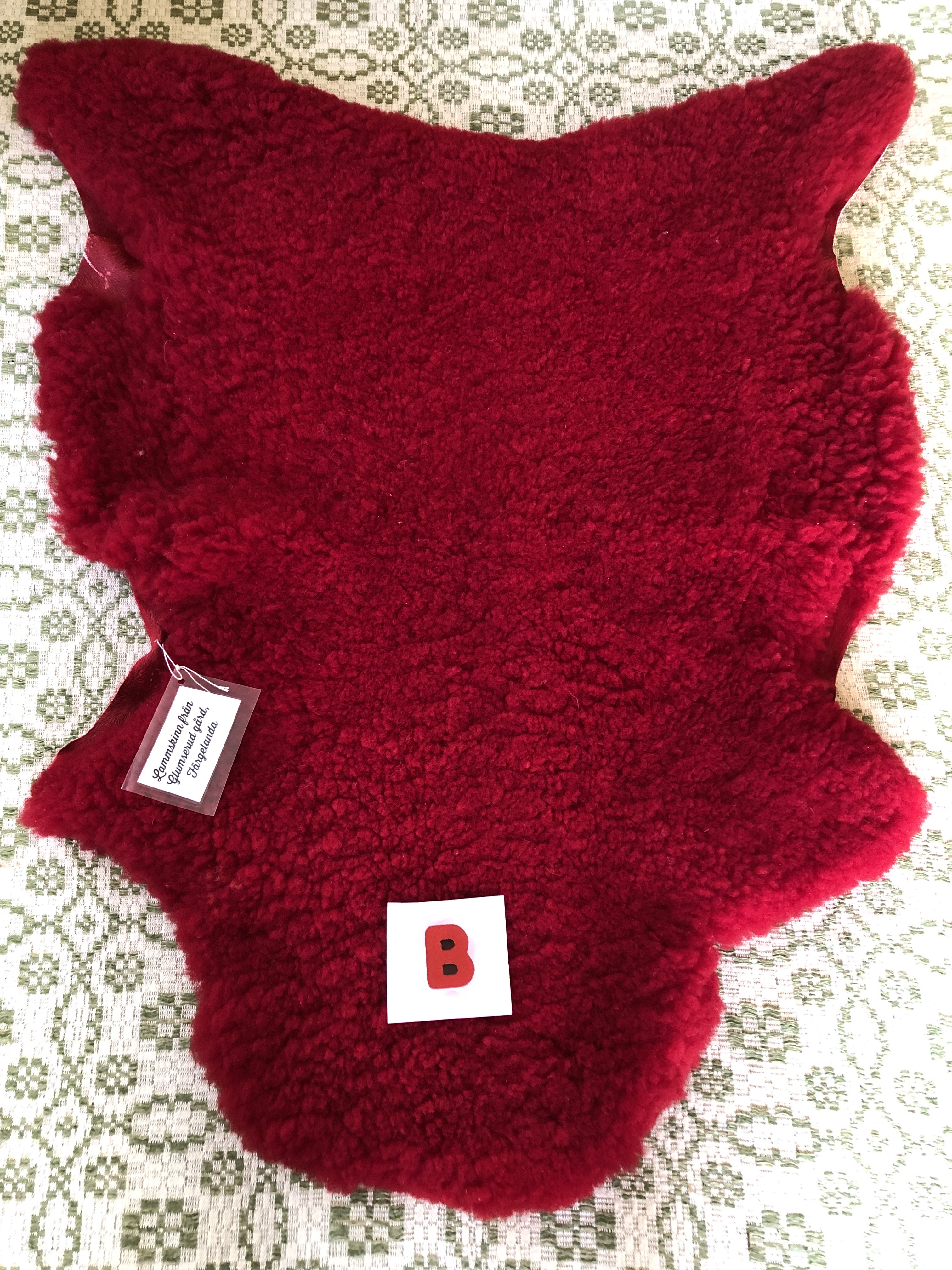 B. Rött färgat skinn, fluffigt, 92 cm x 77 cm, 1600 kr ❌såld ❌