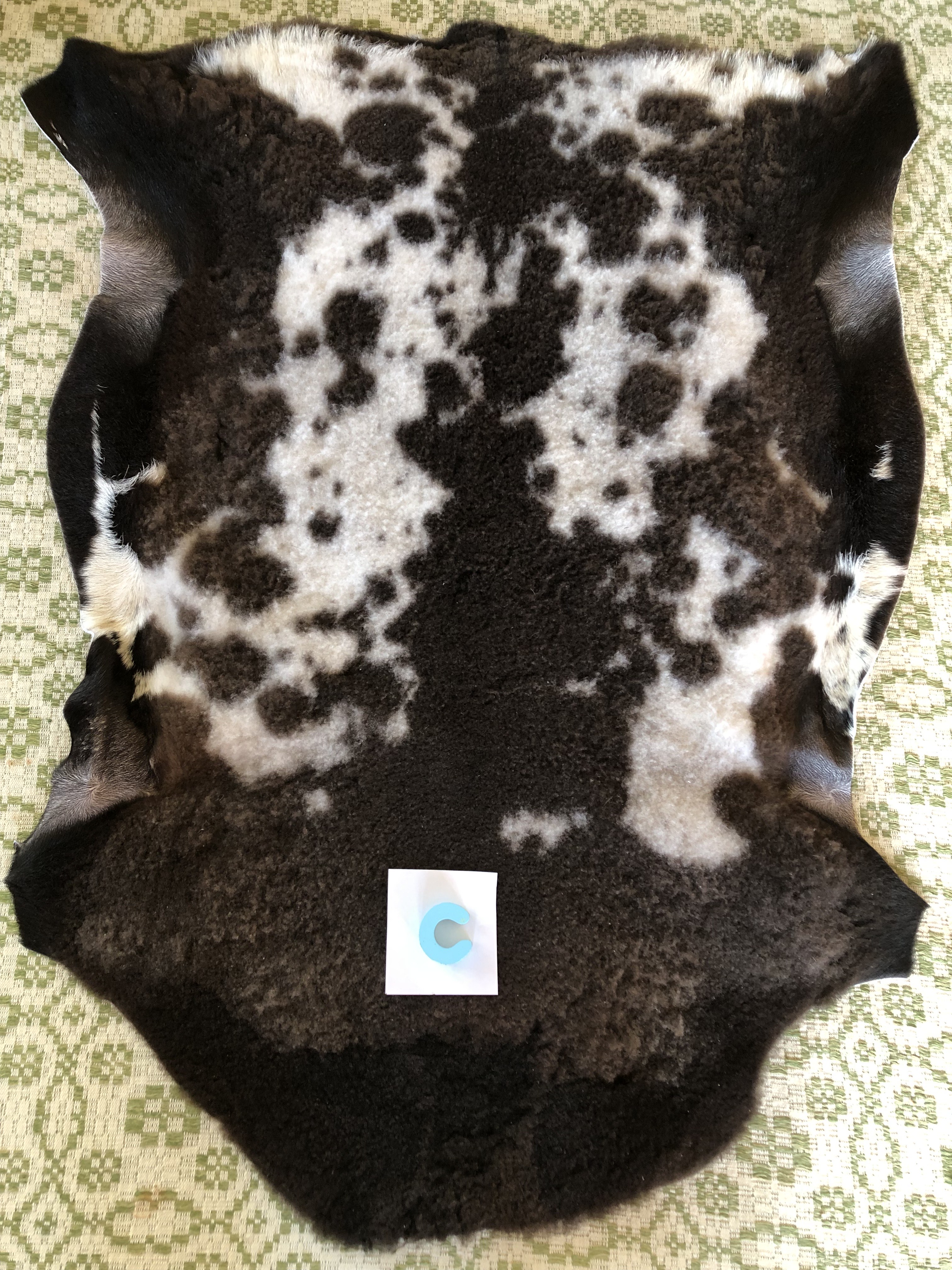 C. Svart/brunt/vitt fläckigt skinn, tunn ull, 105 x 76 cm, 1100 kr ❌såld ❌