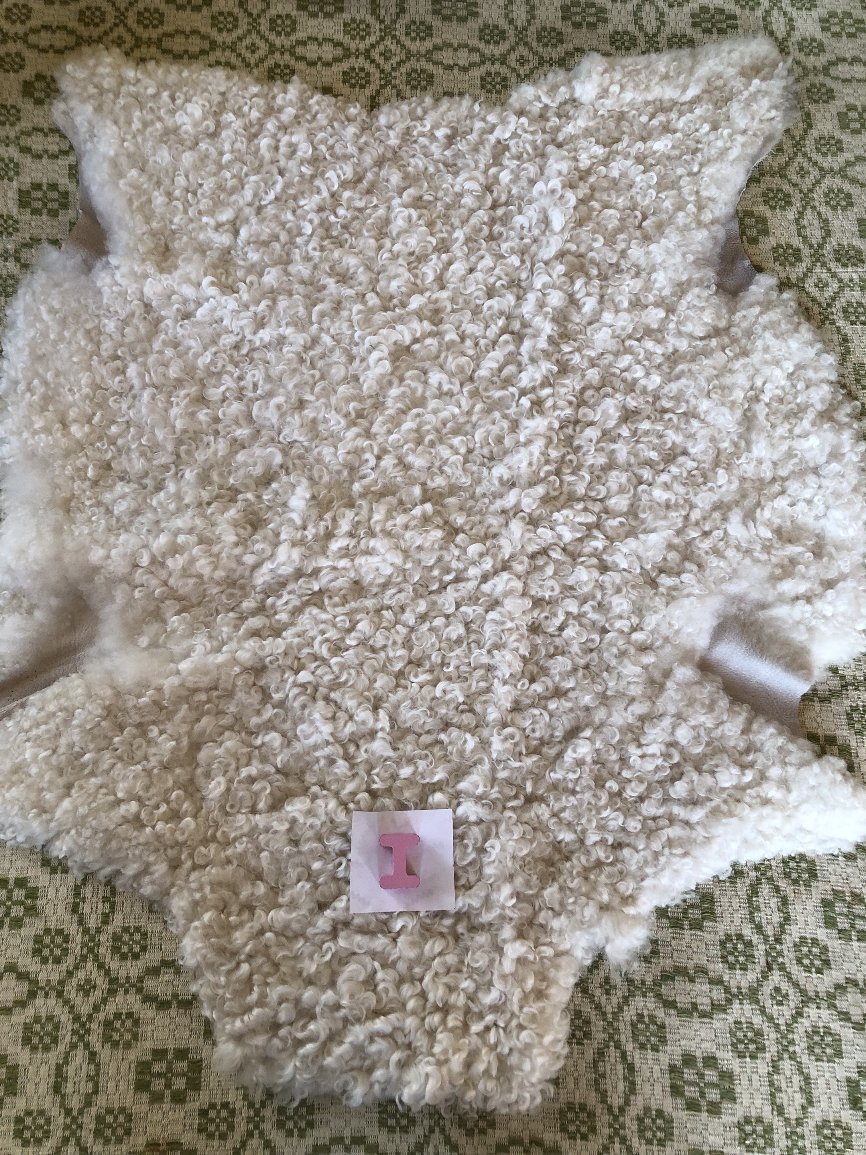 I. Vitt, lockigt, glansigt skinn med mindre lockar, 98 x 84 cm, 2600 kr