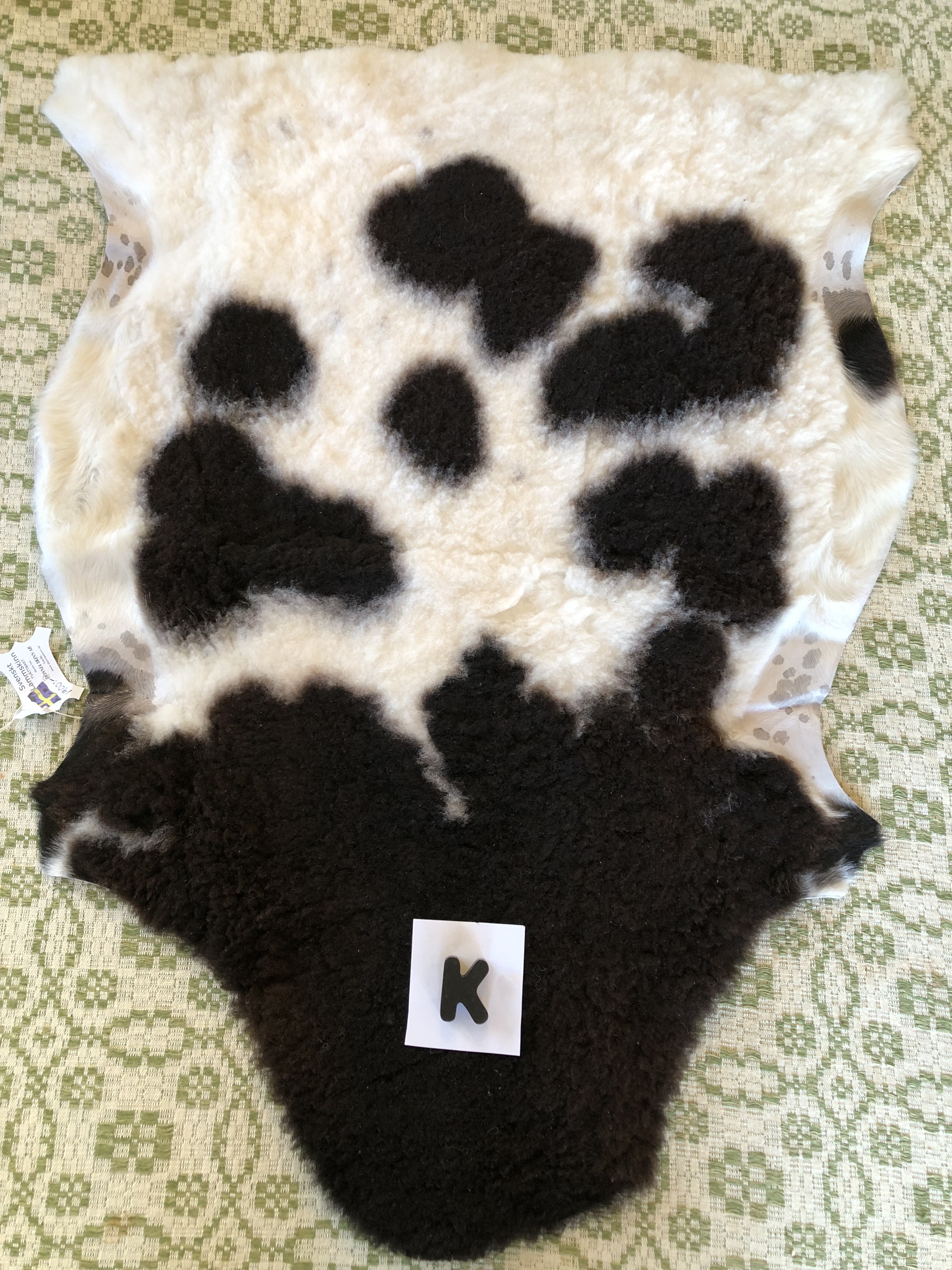 K. Svart, vitt fläckigt skinn, medel ull, 99 cm x 74 cm, 1700 kr